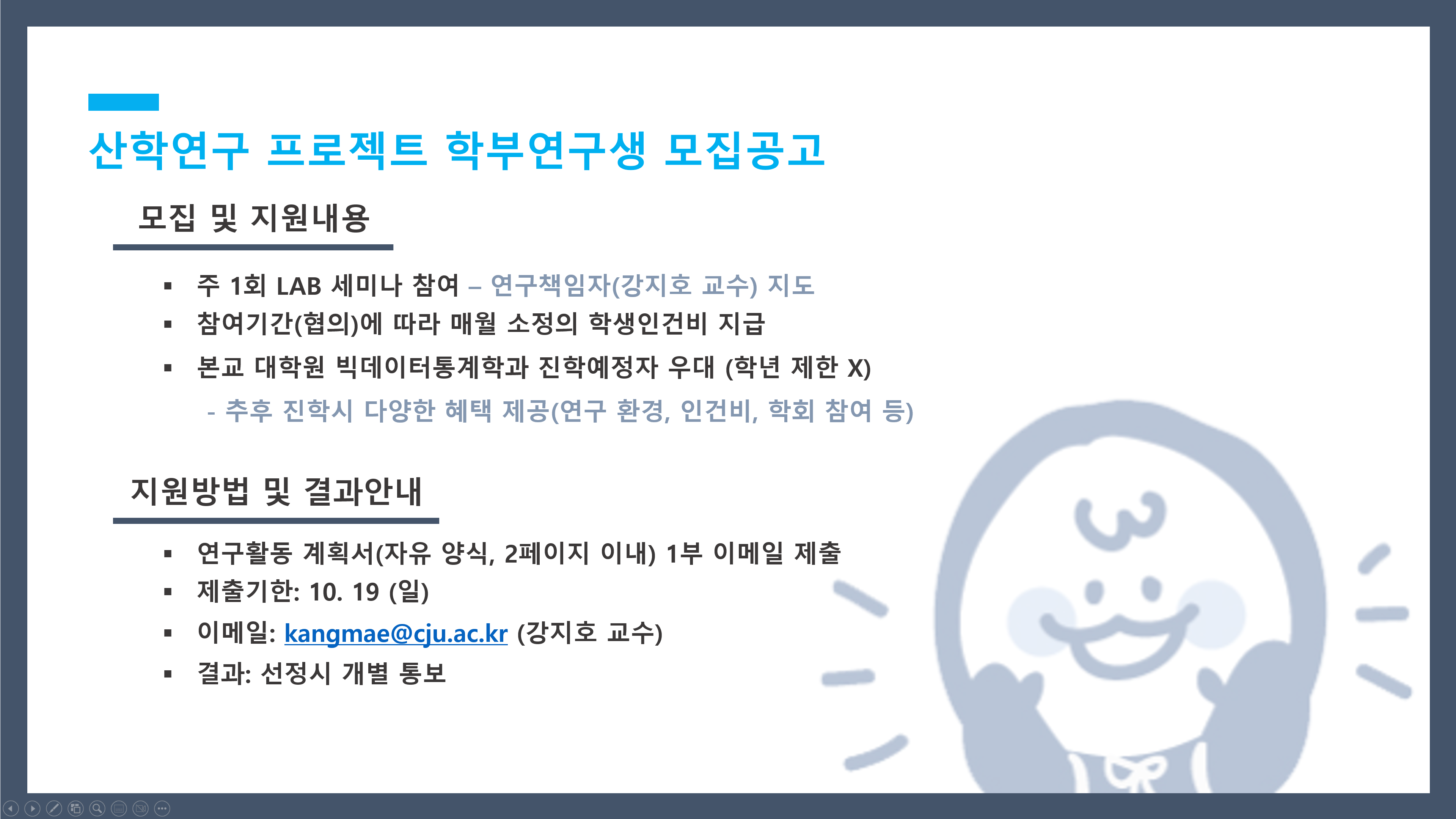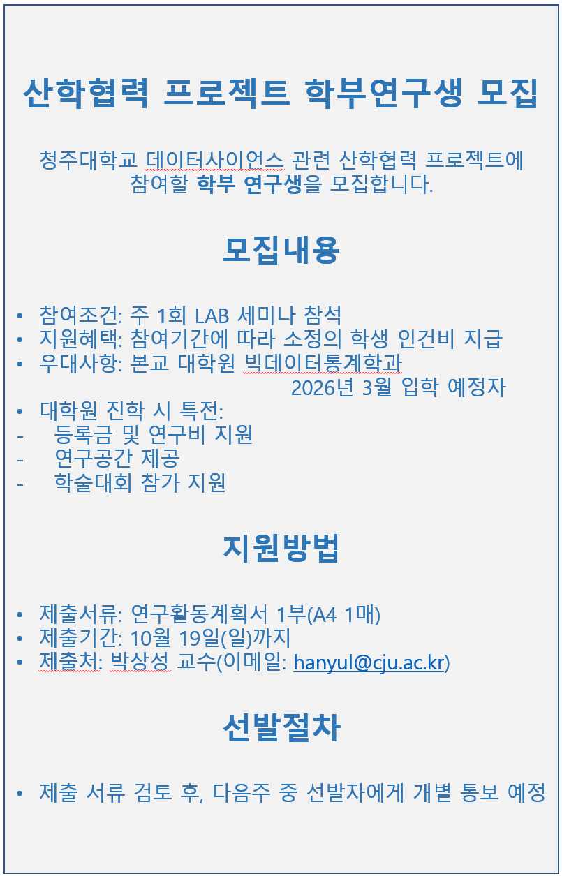 청주대학교 데이터사이언스학과 관련 산학협력 프로젝트에 참여할 학부연구생을 모집합니다.