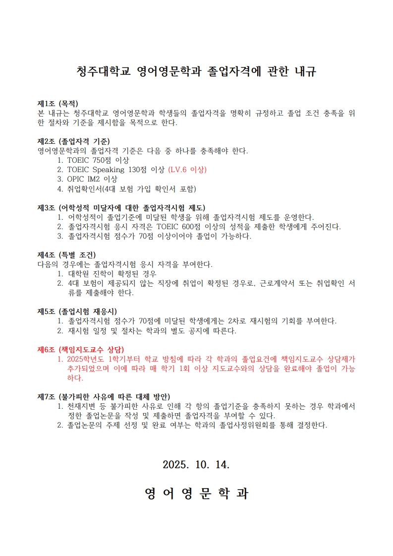 공지사항 HOME 열린마당 공지사항 프린트 공지사항 상세보기, 제목, 내용, 파일등의 정보를 제공합니다. 제목 청주대학교 영어영문학과 졸업자격에 관한 내규 사진 확대보기 졸업자격에 관한 내규 확인하시고 졸업 준비하시기 바랍니다. 파일 영어영문학과 졸업자격에 관한 내규10.14.jpg 영어영문학과 졸업자격에 관한 내규10.14.pdf 목록 다음글 2025-2학기 학점포기제도 안내 (2025. 10. 21.(화) 10:00~10. 23.(목) 18:00)