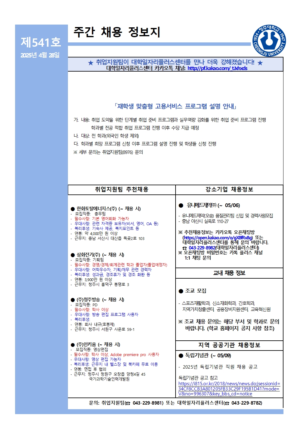 취업게시판 HOME 취업&진로 취업게시판 프린트 취업게시판 상세보기, 제목, 내용, 파일, 작성자등의 정보를 제공합니다. 제목 채용정보 소식지 제541호 사진 확대보기 채용정보 소식지 제541호입니다. 파일 채용정보 소식지 제541호.jpg 작성자 복재엽 (수학교육과) 목록 이전글 채용정보 소식지 제542호 다음글 채용정보 소식지 제540호