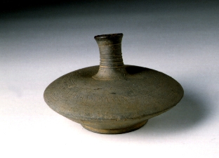 정선된 점토질 태토로 고온 소성한 경질토기로서 색조는 회색을 띠고 있다. 낮은 굽 위에 원반처럼 납작한 특이한 모양의 동체부를 가졌으며 목은 원통형으로 곧게 올라가다가 입술부분에서 약간 벌어졌다. 현재 목이 한쪽으로 기울어져 있으며 목의 하단부에 3조의 음각선대를 돌렸다. 전체의 형태가 특이하여 정확한 용도는 알 수 없으나 술병이나 기름병으로 사용되지 않았을까 추정된다.