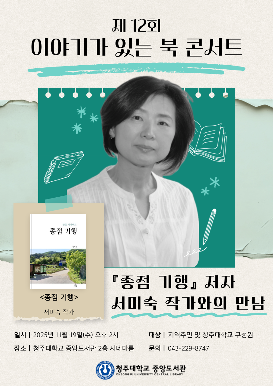 오는 19일 중앙도서관 시네마홀⋯지역주민 참여 가능 ![]() 청주대학교(총장 김윤배)는 오는 19일 오후 2시 중앙도서관 2층 시네마홀에서 ‘종점 기행’의 서미숙 작가를 초청해 ‘이야기가 있는 북 콘서트’를 개최한다고 13일 밝혔다.