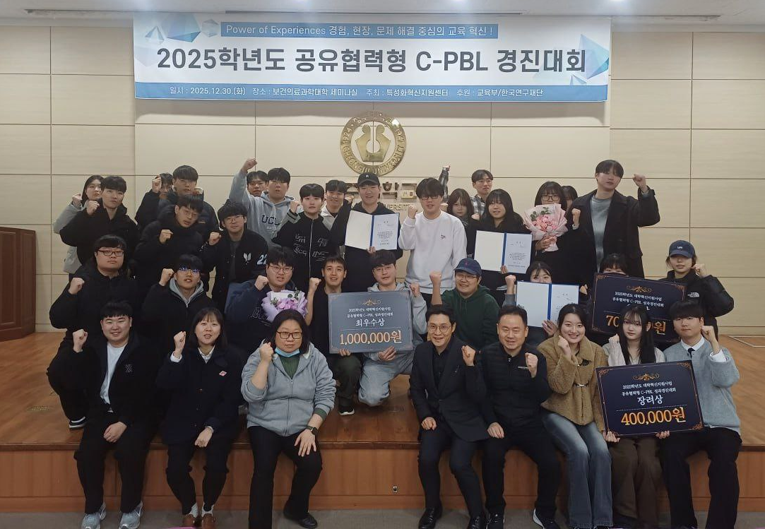 [ 청주대, 공유협력형 C-PBL 경진대회 성료 ] 지자체 등과 협업해 현장 문제 해결방식으로 진행 청주대학교(총장 김윤배)는 최근 ‘2025학년도 2학기 공유협력형 C-PBL(Collaboration Problem-Based Learning) 경진대회 및 시상식’을 개최했다고 31일 밝혔다.