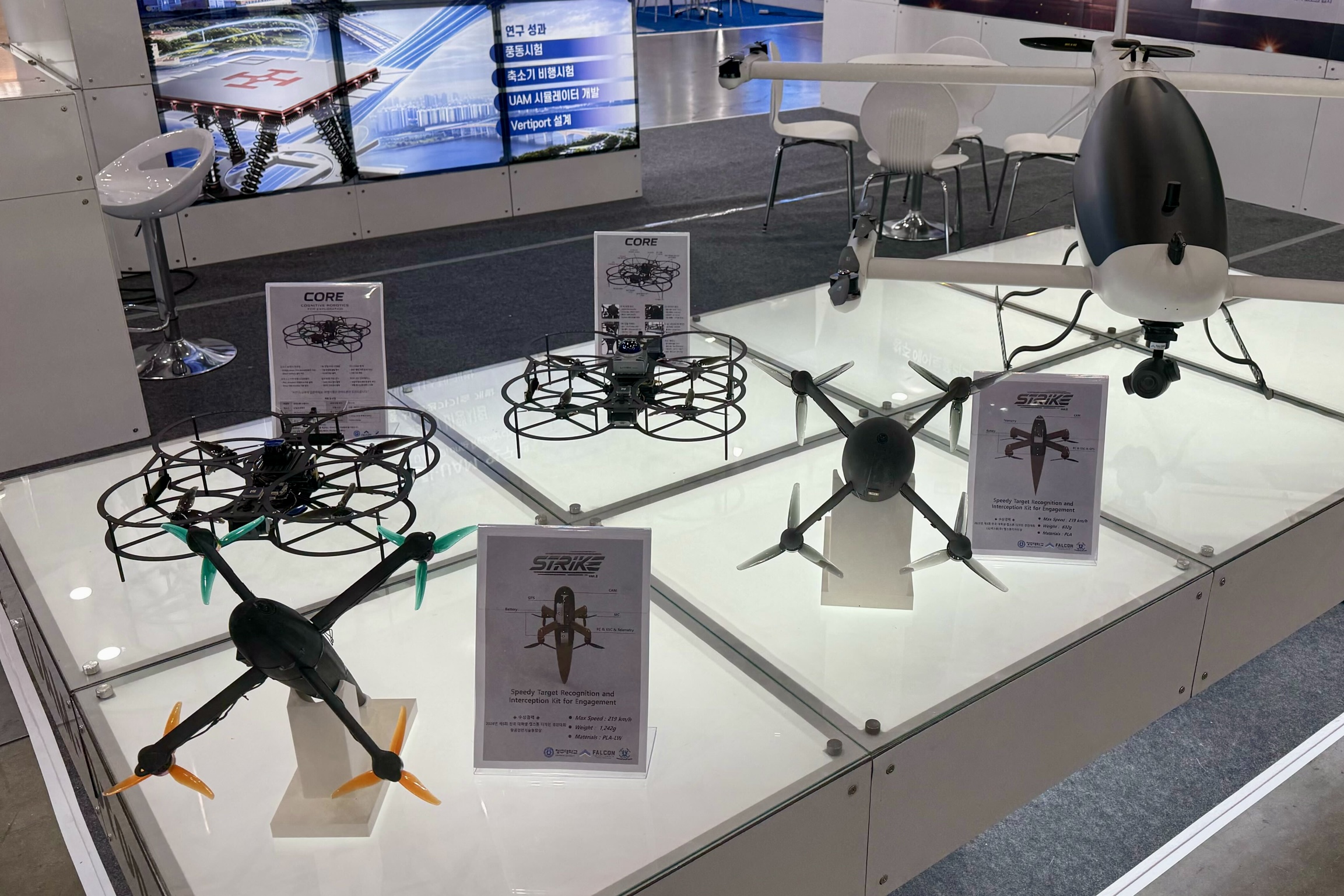 사진설명 : 드론쇼코리아 충북드론UAM연구센터 부스에 전시된 직충돌형 안티드론과 AI연구용 드론 플랫폼.