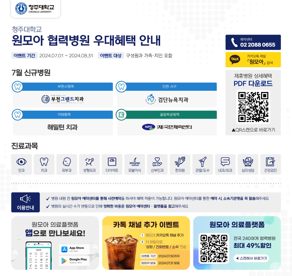 청주대학교 구성원 및 가족(지인포함)대상 혜택으로 상담예약센터를 통한 사전예약 시 제휴적용이 가능합니다. □ 혜택내용 : - 병 원 : 서울, 경기, 인천, 대전, 부산, 대구 등 13가지 진료과목 비급여 항목의 최대 49% 할인 및 추가 혜택 제공 [안과 / 치과 / 피부과 / 성형외과 / 산부인과 / 모발이식 / 건강검진 / 도수치료 / 심리상담 / 다이어트 / 내.외과 / 한의원 등] - 기 타 : 카셰어링, 건강기능식품 제휴 혜택 할인 □ 7월 신규병원 - 치과 : 부천그랜드치과(부천시청역), 검단뉴욕치과(인천 서구), 해밀턴치과(이태원역) - 건강검진 : (재)국민체력센터(올림픽공원역) □ '분당안과' 프로모션(라섹, 렌즈삽입술) - 프로모션 수술명 : 프리미엄 라섹, 올레이저 라섹, ICL렌즈삽입술 - 프로모션 신청 링크 : https://m.site.naver.com/1o5aO - 링크 접속 불가 시 '원모아 예약센터'로 문의 바랍니다. □ '강남에이스안과 x 알콘사' 프로모션(노안 백내장) - 프로모션 수술명 : 노안 백내장 - 프로모션 신청 링크 : https://m.site.naver.com/1pETx - 링크 접속 불가 시 '원모아 예약센터'로 문의 바랍니다. □ '가다실9가 x 예쁨주의쁨' 프로모션(VAT별도) - 프로모션 : 가다실9가 접종 - 프로모션 신청 링크 : https://m.site.naver.com/1pBP9 - 링크 접속 불가 시 '원모아 예약센터'로 문의 바랍니다. □ 진료과목별 상세 내용 확인 - [전국 협력 병원 예약] : https://www.onemoawf.net - 상세혜택파일 : PDF파일 첨부 □ 원모아 예약센터 - 전화예약상담 : 02-2088-0655 - 카톡채널상담 : http://pf.kakao.com/_SaJps 원모아 예약상담센터로 ' 청주대학교 '소속임을 말씀해 주셔야 우대가 혜택을 받으실 수 있습니다. |
